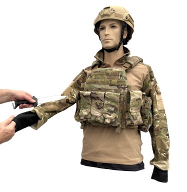 De snijwerende, steekwerende en scherfwerende mouwen beschermen de armen tegen verwonding van messen, glasscherven of rondvliegend puin van een bom explosie. De zwarte kleur past uitsteken bij het zwarte uniform van bewakingsagenten.